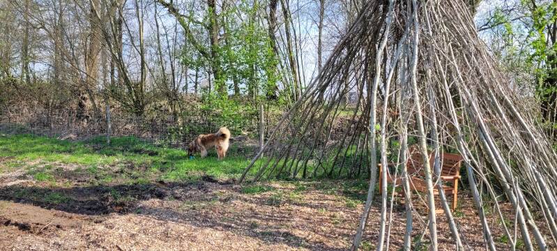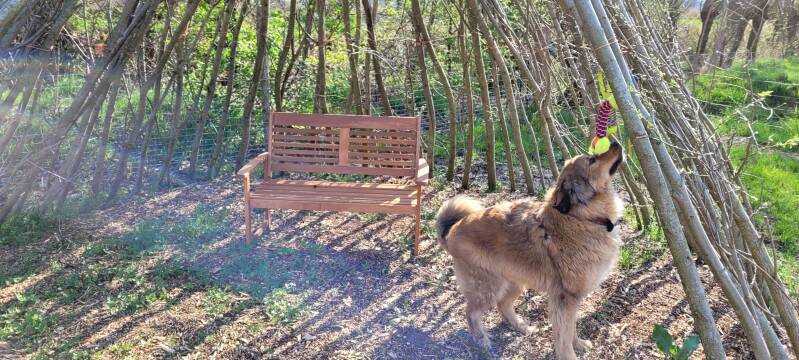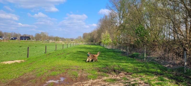 Hier kunnen honden loslopen, rennen en spelen. De baasjes kunnen zitten op het bankje in ons zelfgemaakte prieeltje. Ook hangen hier een paar speeltjes voor de honden. Graag na gebruik de speeltjes weer terughangen.
